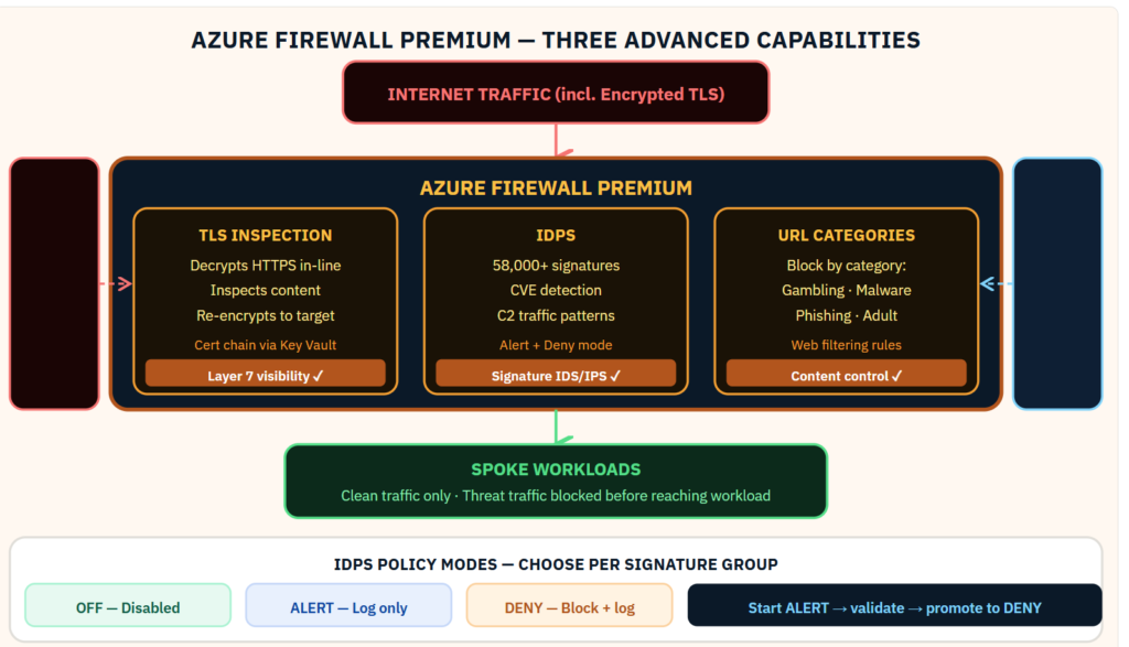 Most Azure Firewall deployments use 20% of what the Premium SKU can do. Here is what the other 80% looks like.Azure Firewall Standard enforces network rules and application FQDN rules. That is the foundation. Azure Firewall Premium adds three capabilities that change what the firewall can actually detect. TLS inspection. IDPS with 58,000+ signatures. URL categorization. Together they shift the firewall from a network-layer control to a Layer 7 security service that can identify threats in encrypted traffic — the traffic that most network security tools are blind to. In every hub-spoke environment I design for regulated financial services, these three Premium features are non-negotiable. Here is how they fit together: