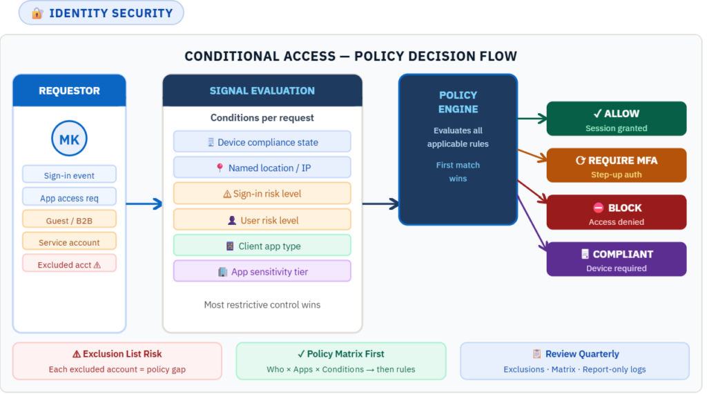 Before writing a single Conditional Access rule, build a policy matrix. Map every user population to the apps they access, the conditions that apply, and the controls required. A matrix forces clarity. It makes gaps visible before they become incidents.