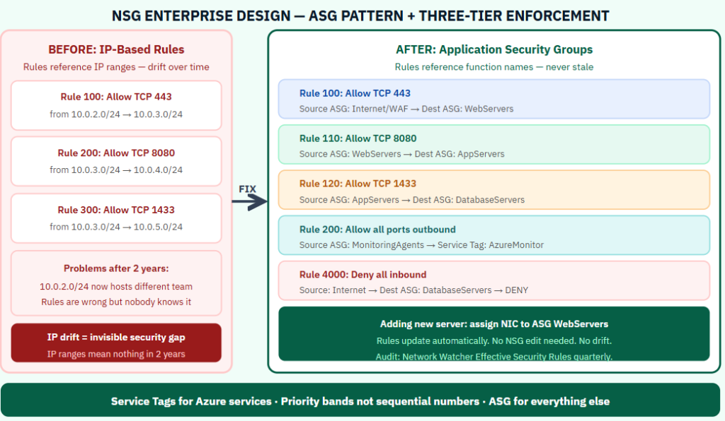NSG rules that reference IP address ranges create a hidden dependency between the rule and the infrastructure topology. When VNETs are reorganized, subnets are moved, or compute is migrated to new address spaces, the rules become inaccurate without any warning. The rule still allows traffic. It just allows it to a different set of servers than it was intended to.